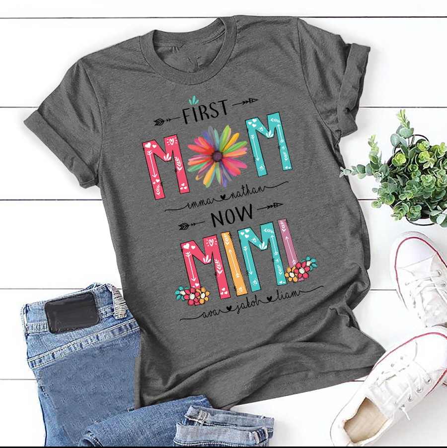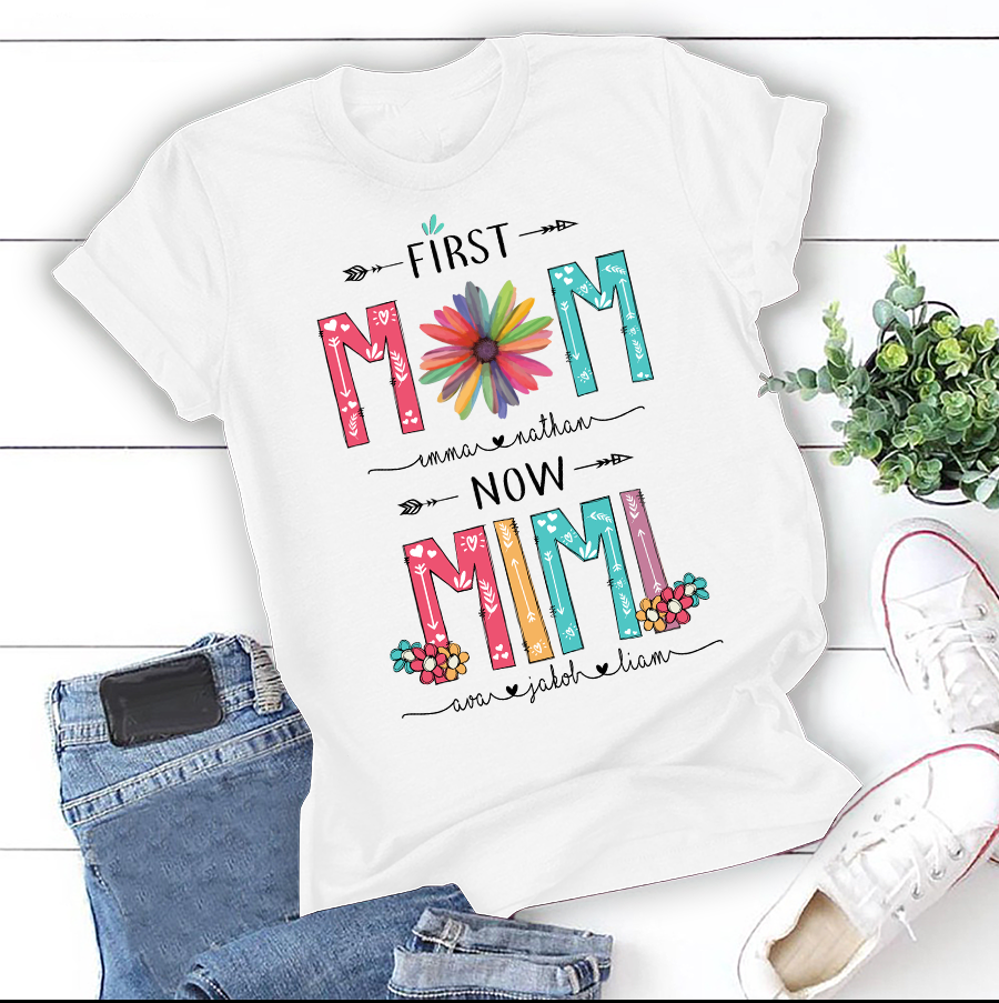 Apayprint -First Mom Now Mimi, Nana, Grandma, Gigi | Personalized T-Shirt, S – 5XL, White Grey Pink Blue Black