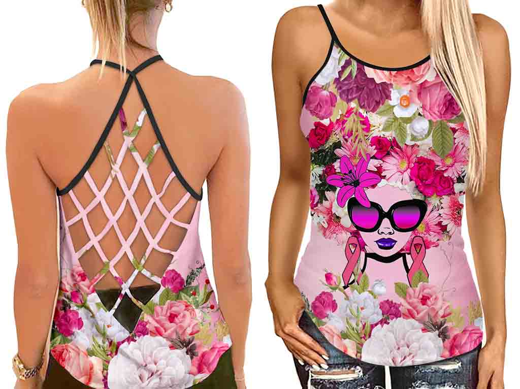 Black Girl Pink Breast Cancer Awarness Tank Top Summer Shirt Women – Flower Pink Girl Cross Open Back Camisole Tank