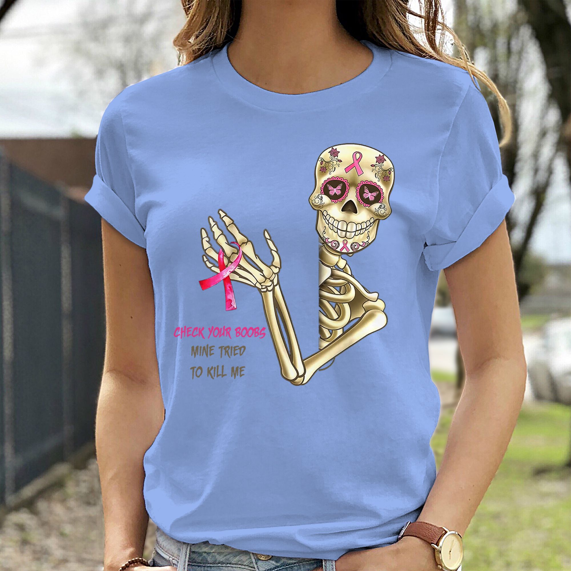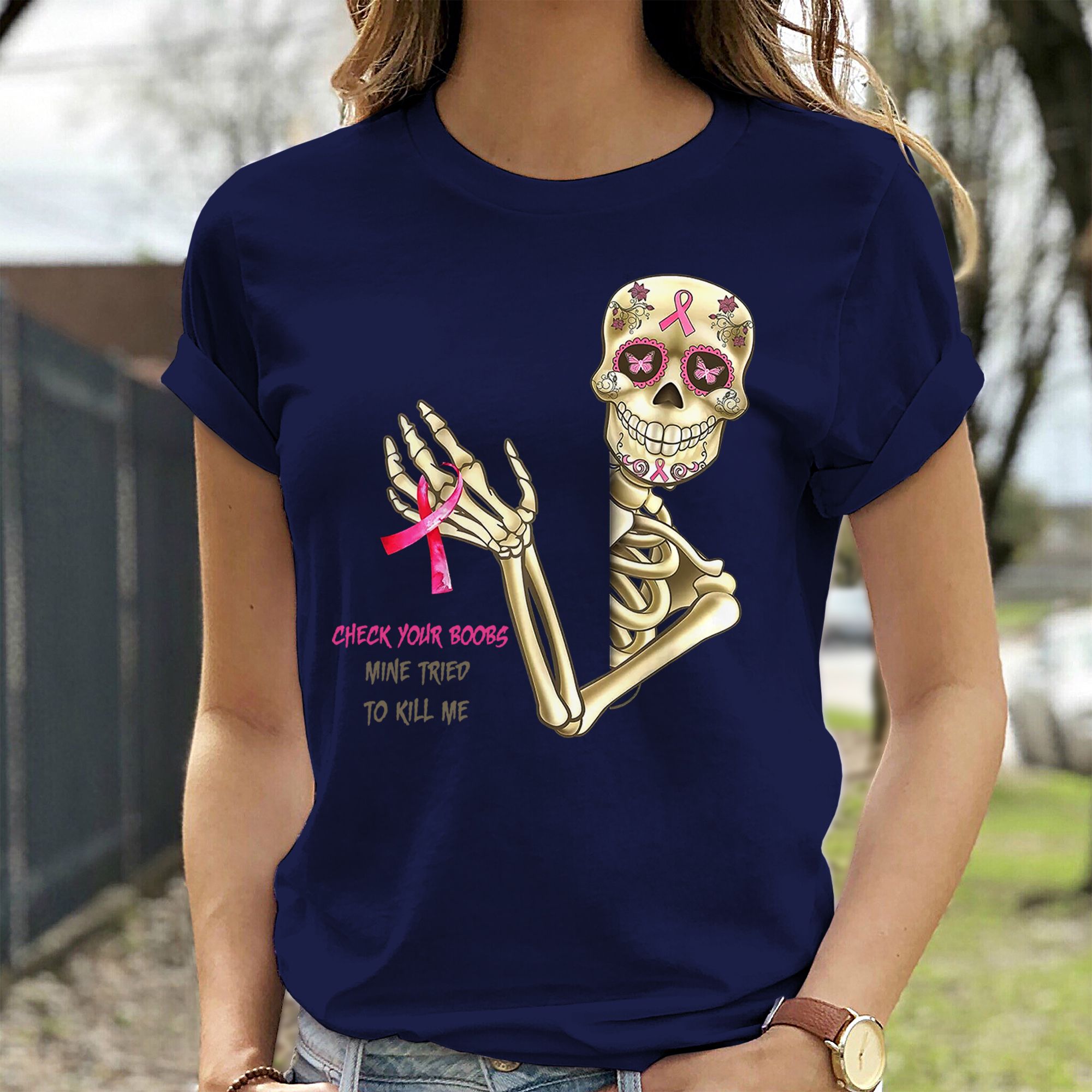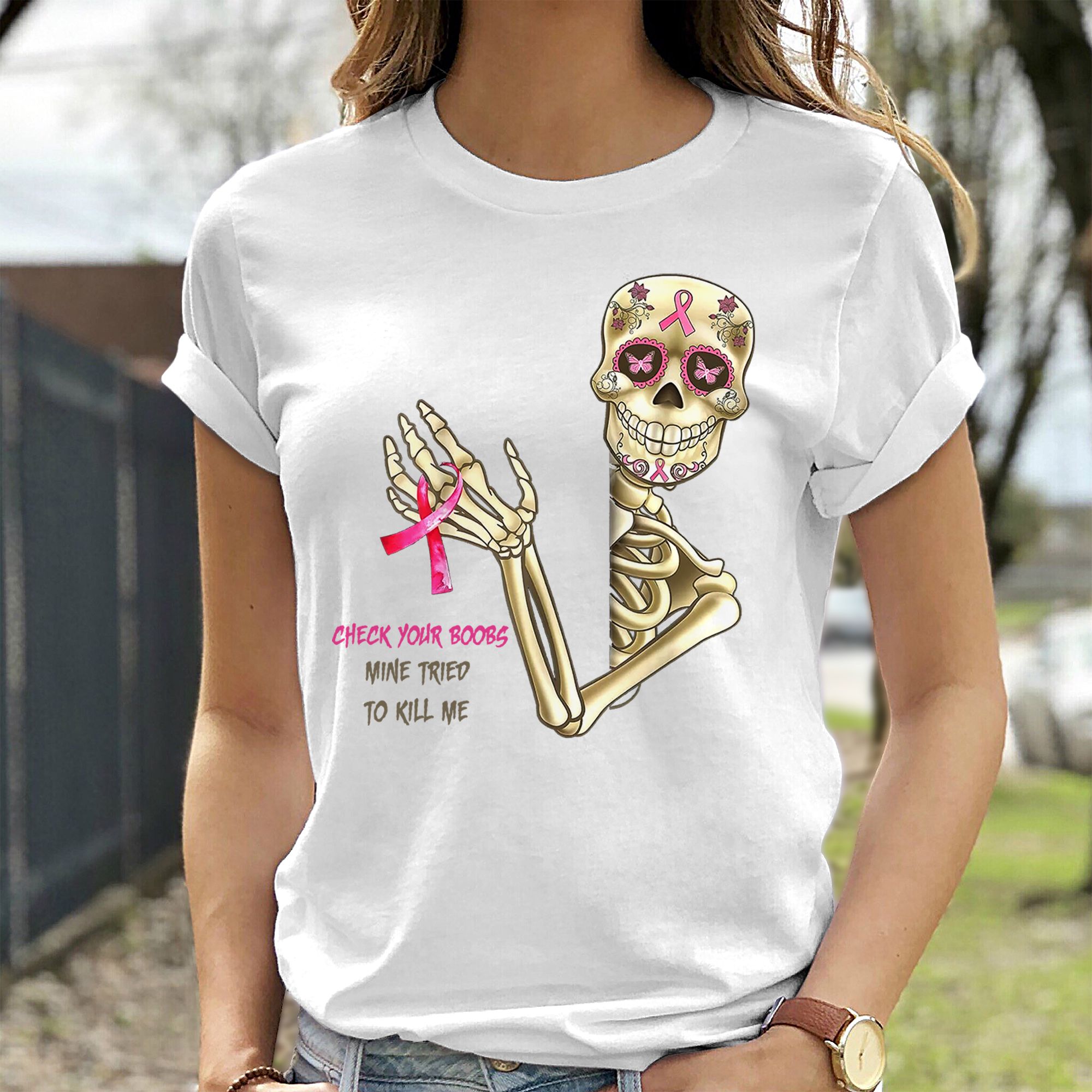 Breast Cancer Awareness Shirts – Skeleton Check Your Boobs Mine Tried To Kill Me