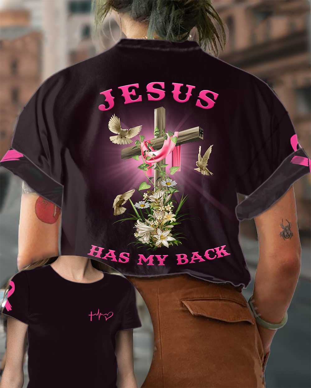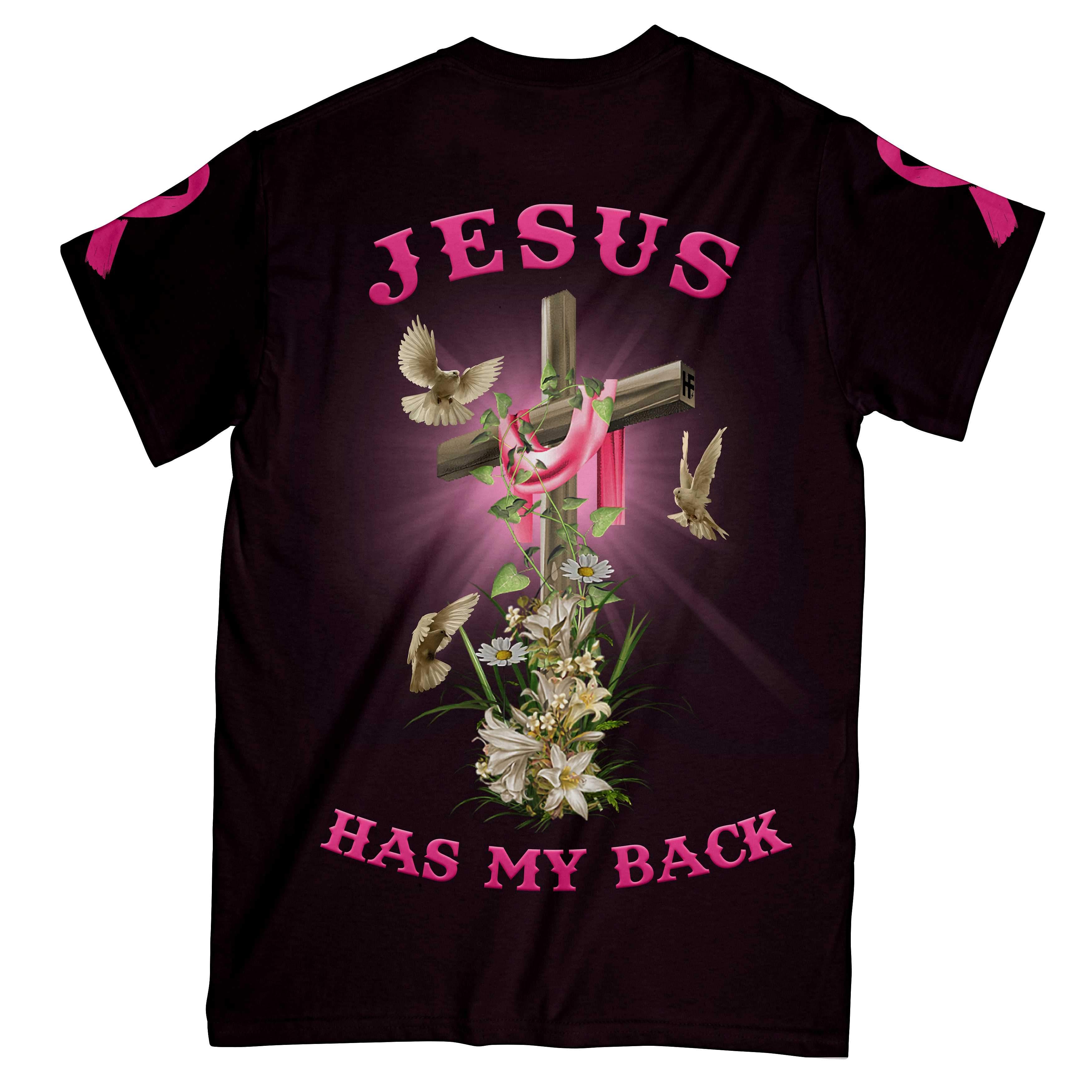 Breast Cancer Jesus Has My Back All Over Print T-Shirt, Christian Breast Cancer Awareness Shirt
