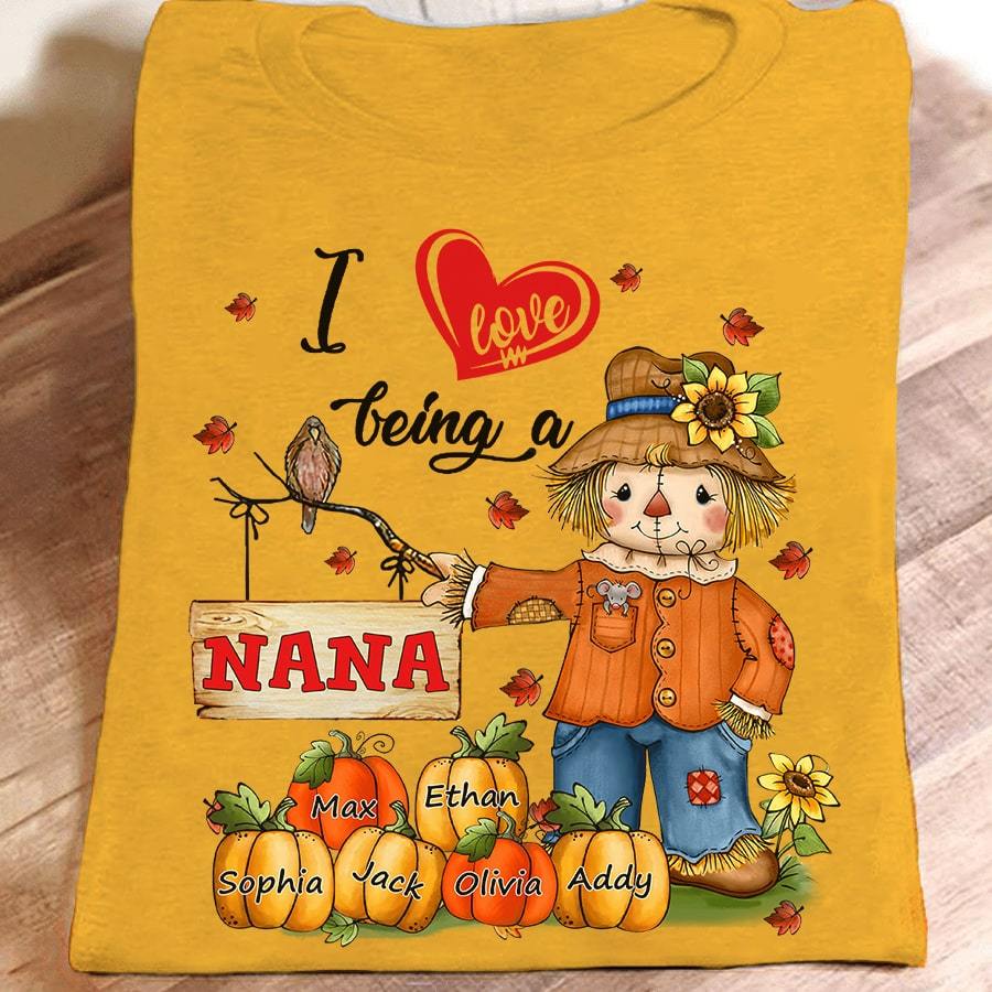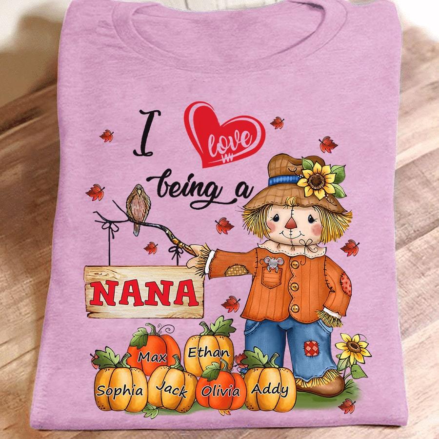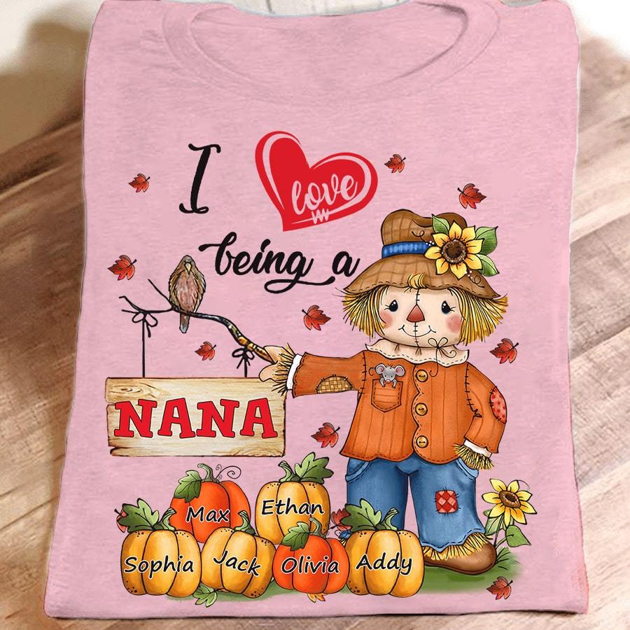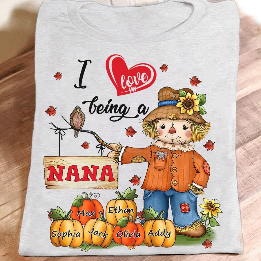 I Love Being A Nana Fall, Personalized Nana With Grandkids Name T-Shirt