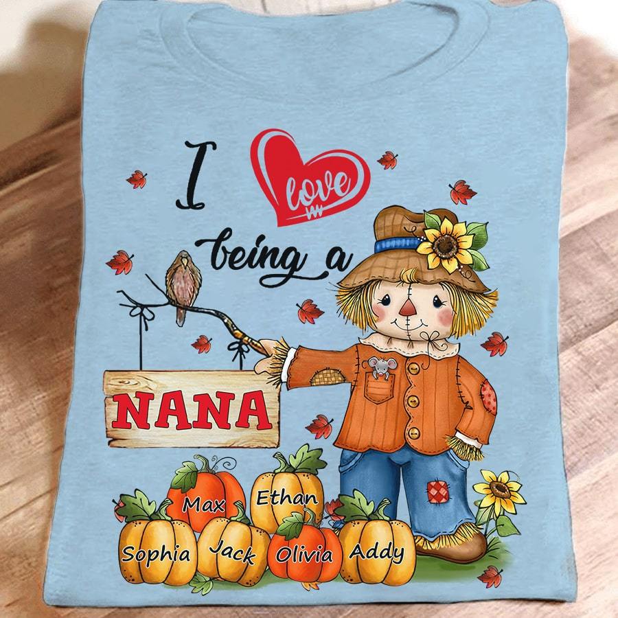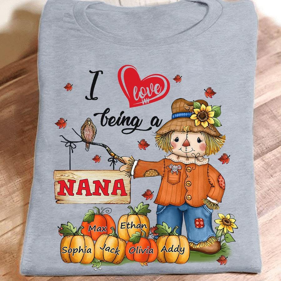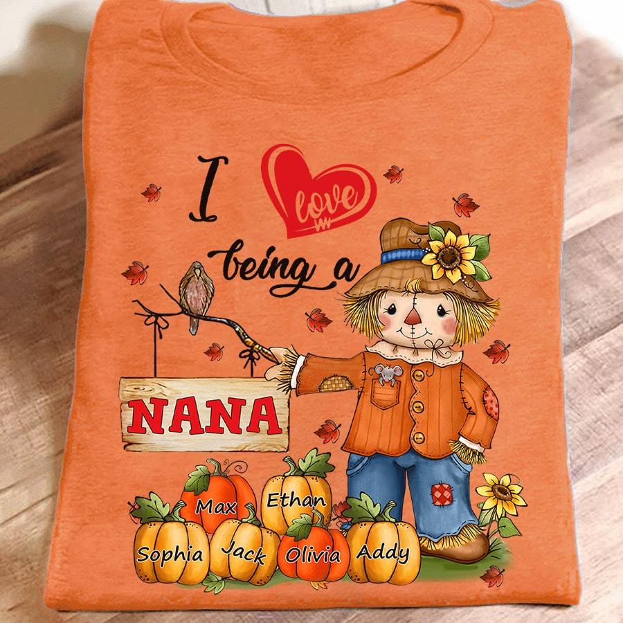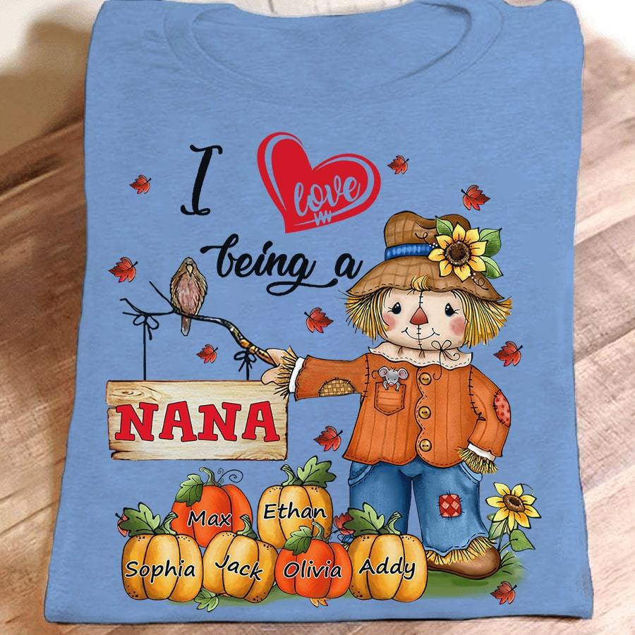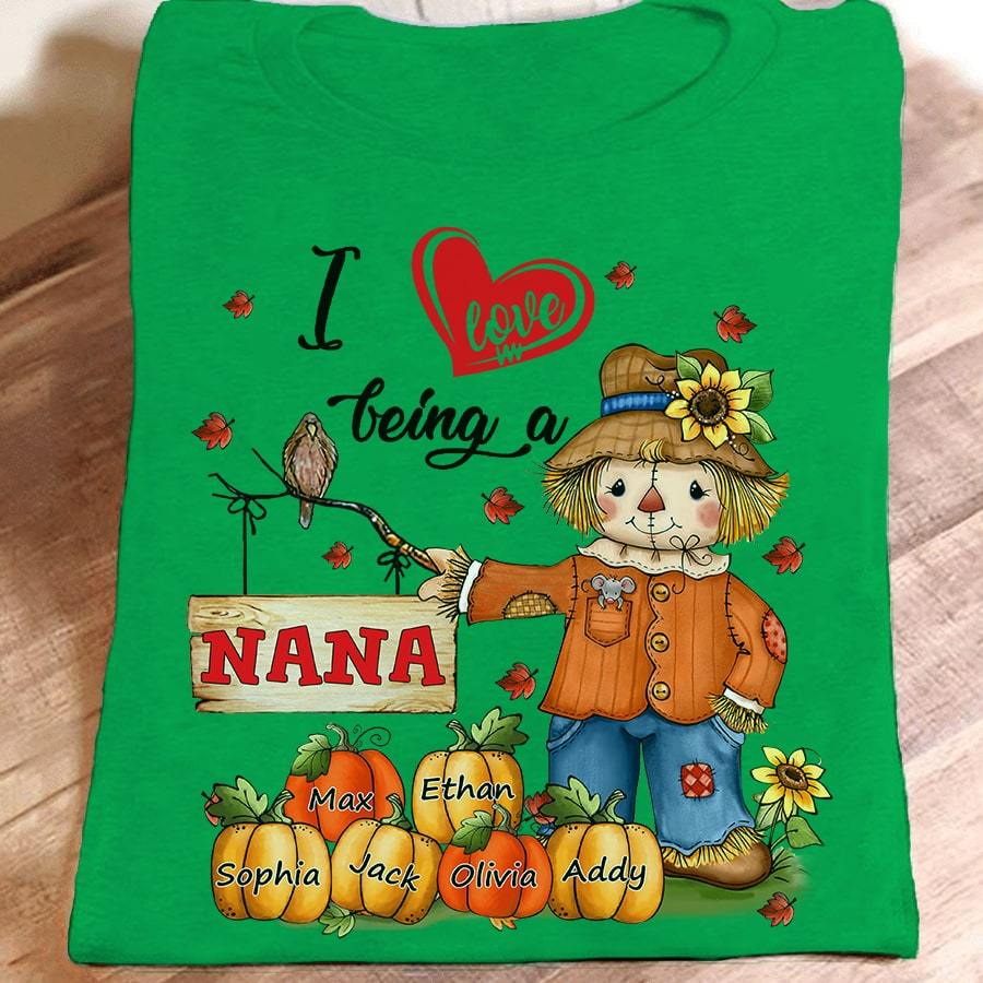 I Love Being A Nana Fall, Personalized Nana With Grandkids Name T-Shirt