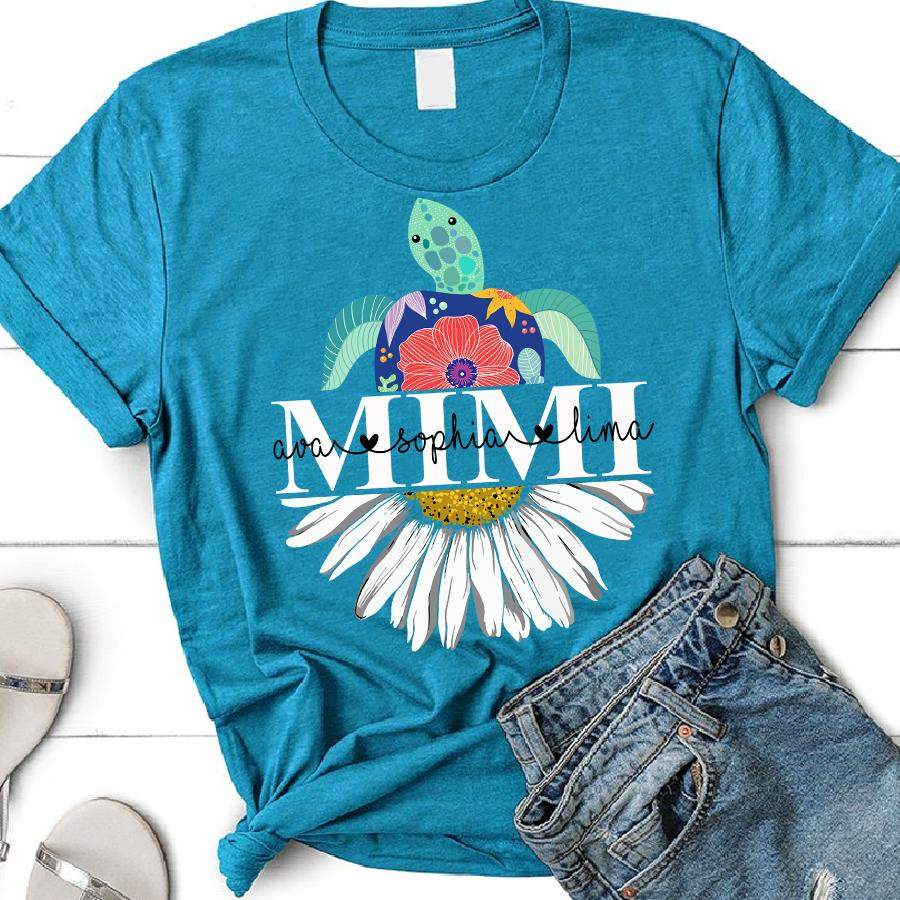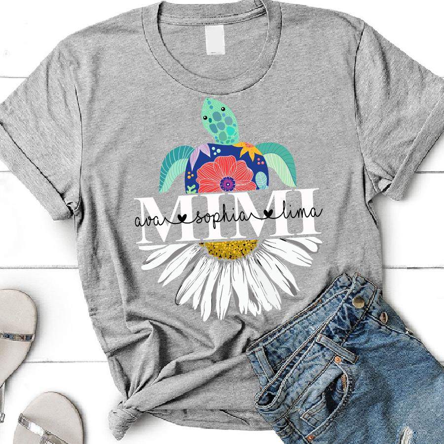 Our print-on-demand products are made with the highest quality materials, ensuring that your personalized Mimi – Turtle Daisy | Personalized T-shirt design looks great and feels comfortable. You can wear your new custom product with pride or give it as a unique and memorable gift that will be cherished for years to come.