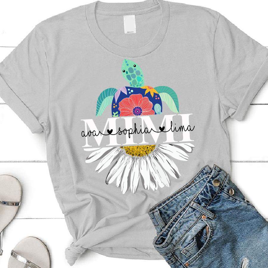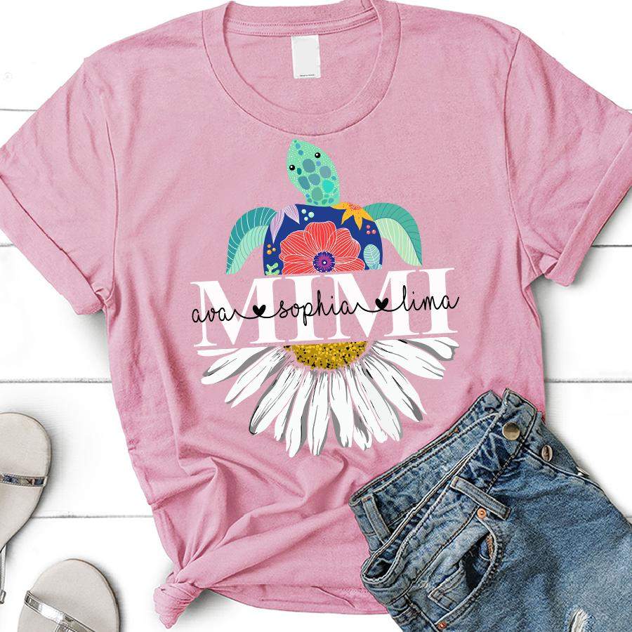 So whether you're looking to show off your own name or create a personalized gift for someone special, LateAndLow Store has got you covered. Start designing your own custom Mimi – Turtle Daisy | Personalized T-shirt print-on-demand product today, and let us bring your vision to life!