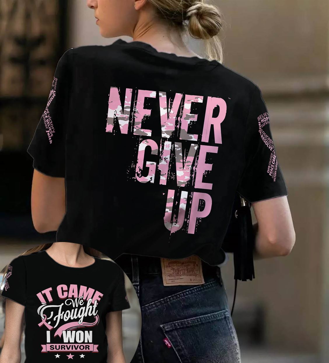 Never Give Up Breast Cancer Warrior All Over Print T-Shirt, Breast Cancer Awareness Month Shirt, Inspirational Breast Cancer Gift