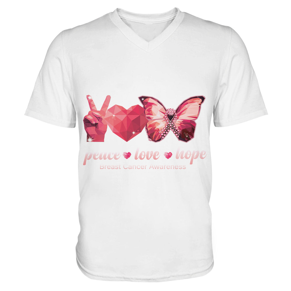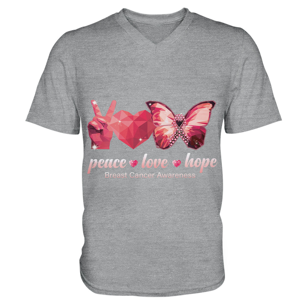 Peace Love Hope Breast Cancer Awareness, Red Ruby Heart Butterfly Awareness Ribbon Unisex V-Neck T-Shirt