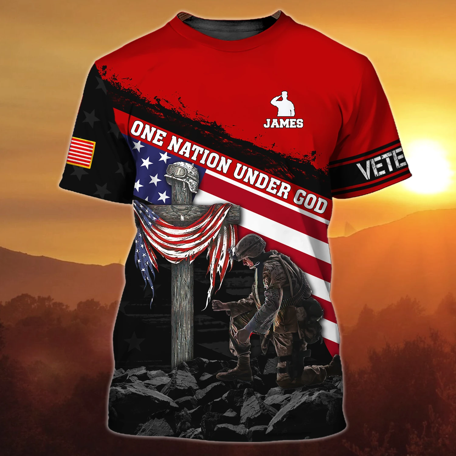 Personalized Name Custom, One Nation Under God Jesus Soldier Kneel Under The Cross 3D Printed T-Shirt