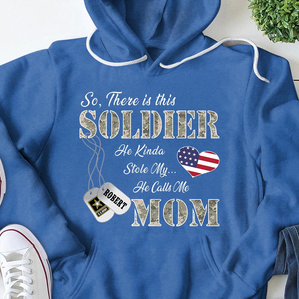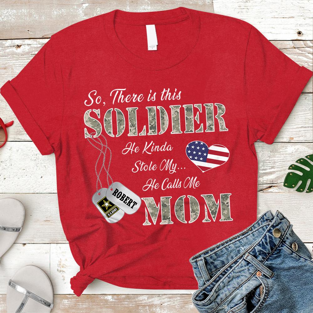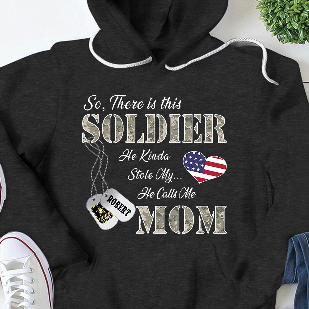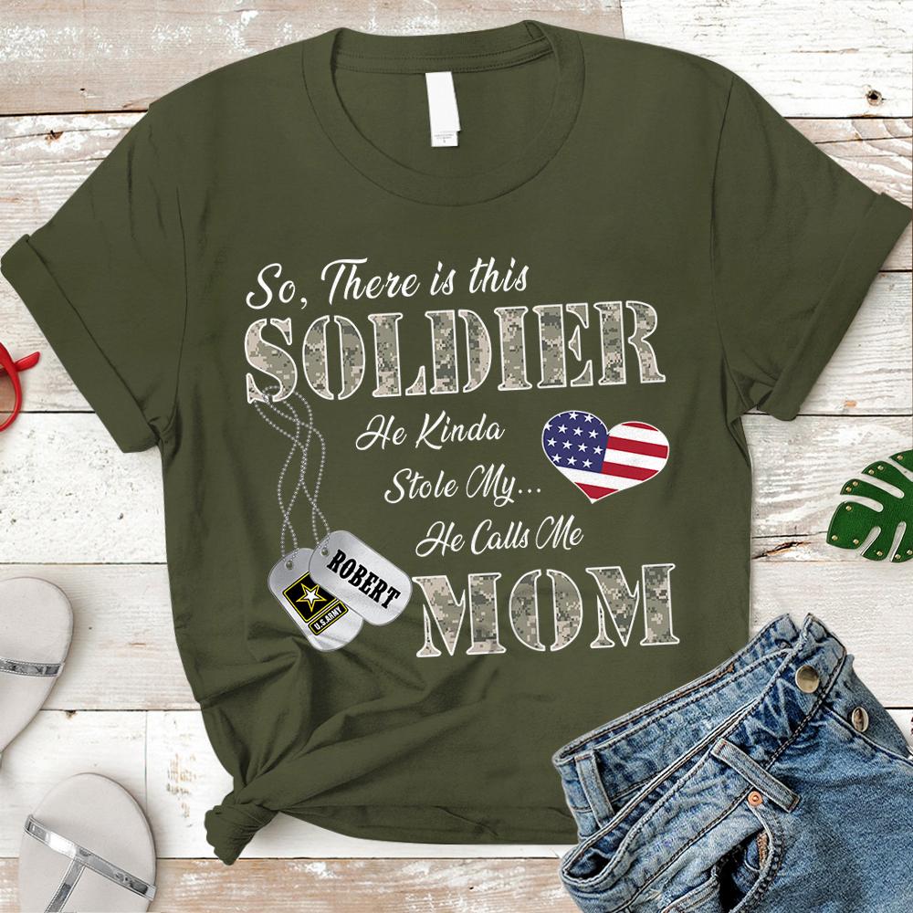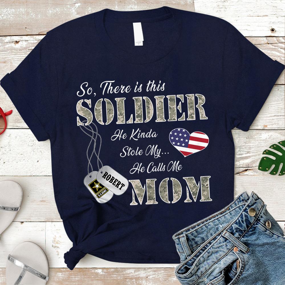 Personalized Name, Family Member & Military Branch So There’S This Soldier He Kinda Stole My Heart He Calls Me Mom Military Tshirt – K1702 – Trhn