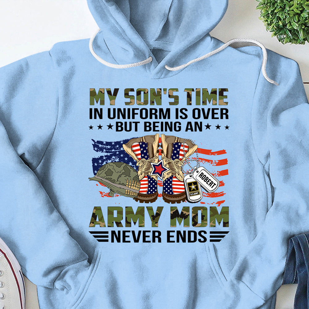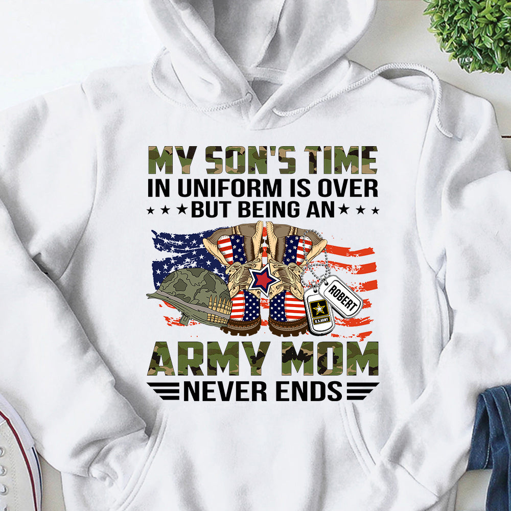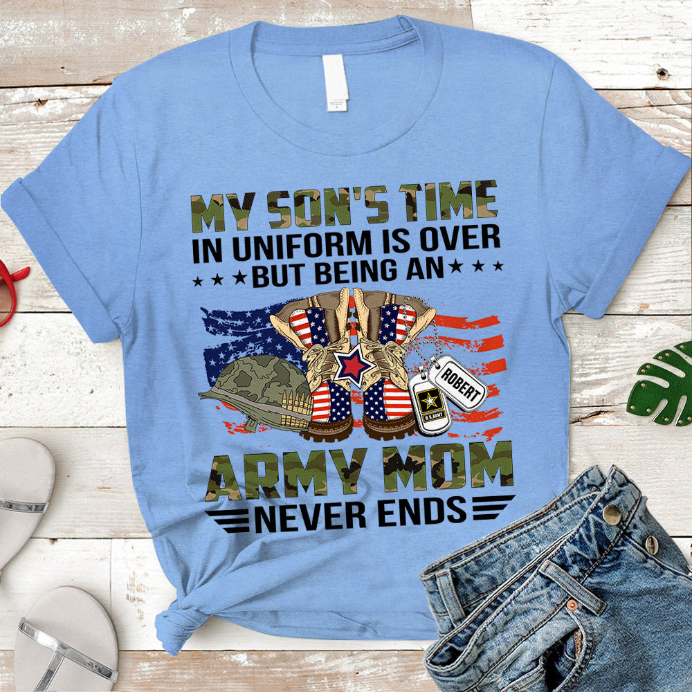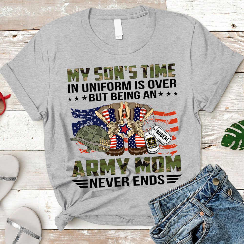 Personalized Name, Military Branchs My Son’S Time In Uniform Is Over But Being An Army Mom Never Ends Family Military Tshirt K1702 Do99