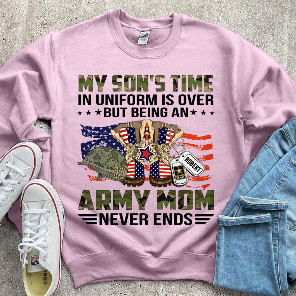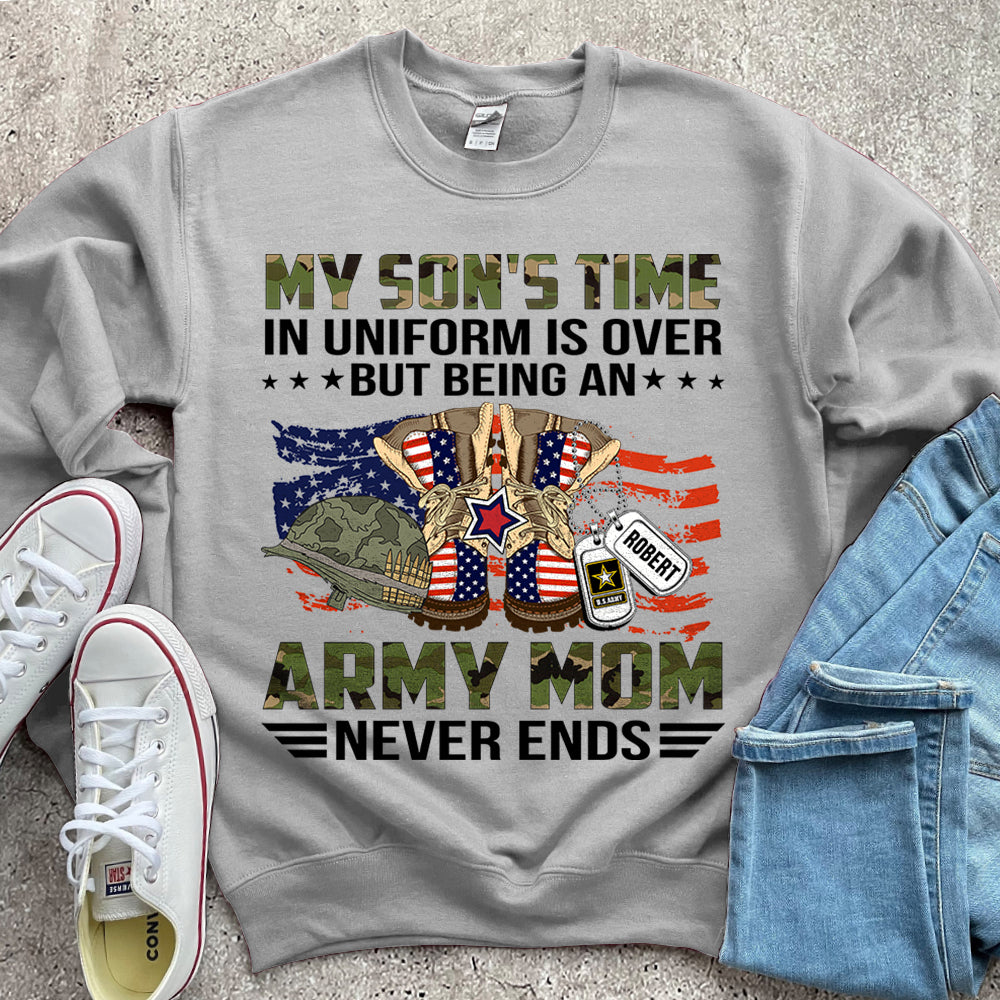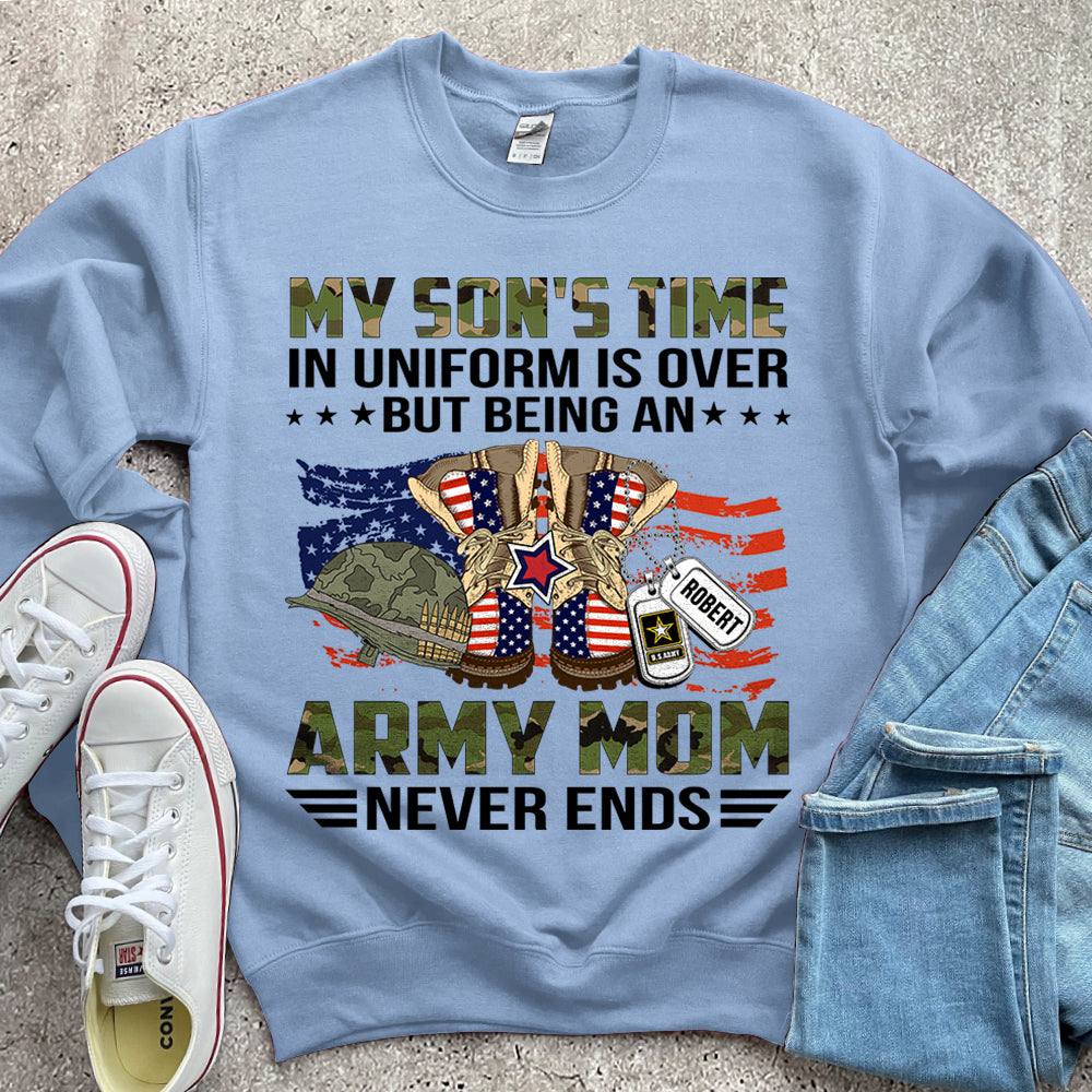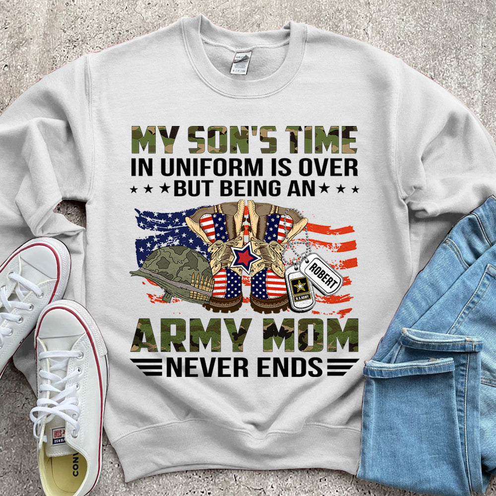 Personalized Name, Military Branchs My Son’S Time In Uniform Is Over But Being An Army Mom Never Ends Family Military Tshirt K1702 Do99