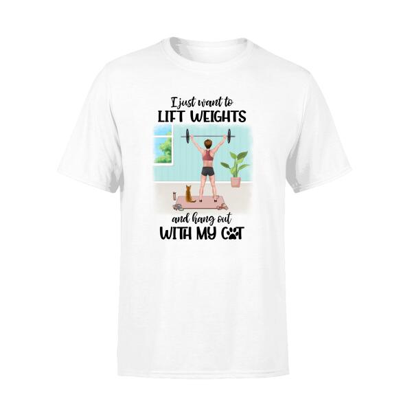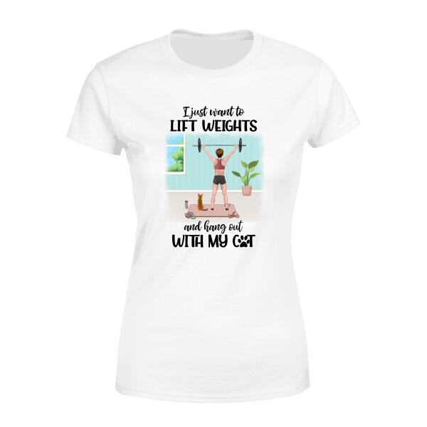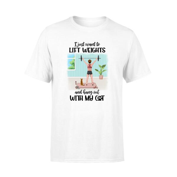 Personalized T-Shirt, Girl Lifting Weights With Cats At Home, Gift For Cat Lover, Fitness Lovers