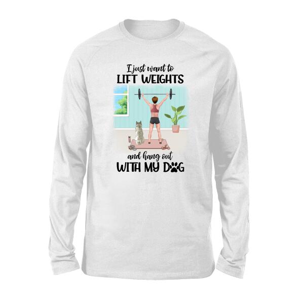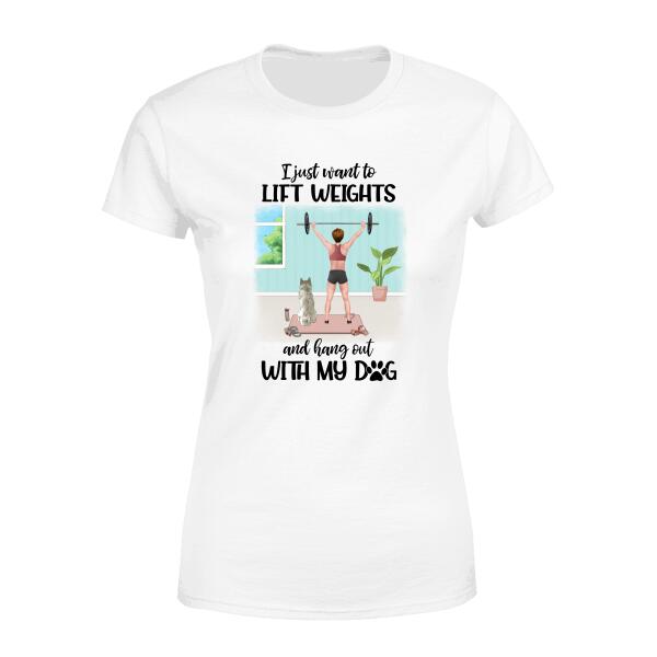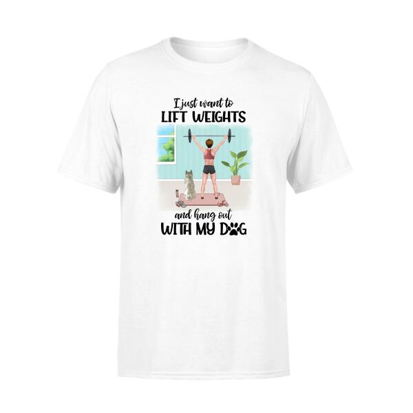 Personalized T-Shirt, Girl Lifting Weights With Dog At Home, Gift For Dog Lovers, Fitness Lovers