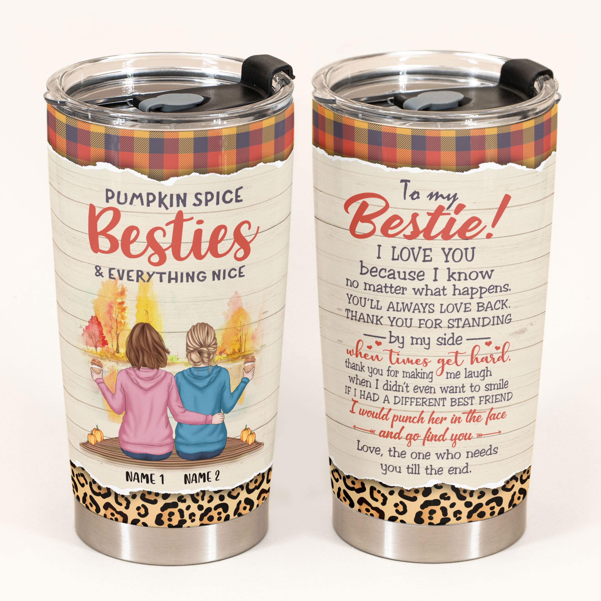 Pumpkin Spice Besties & Everything Nice – Personalized Tumbler Cup – Fall Season Gift For Girl Friend – Friends Hoodie Sitting