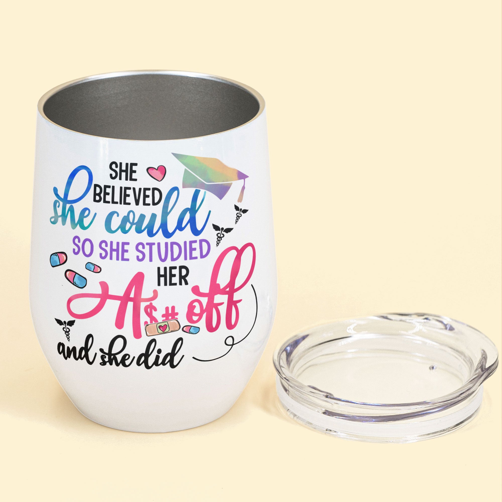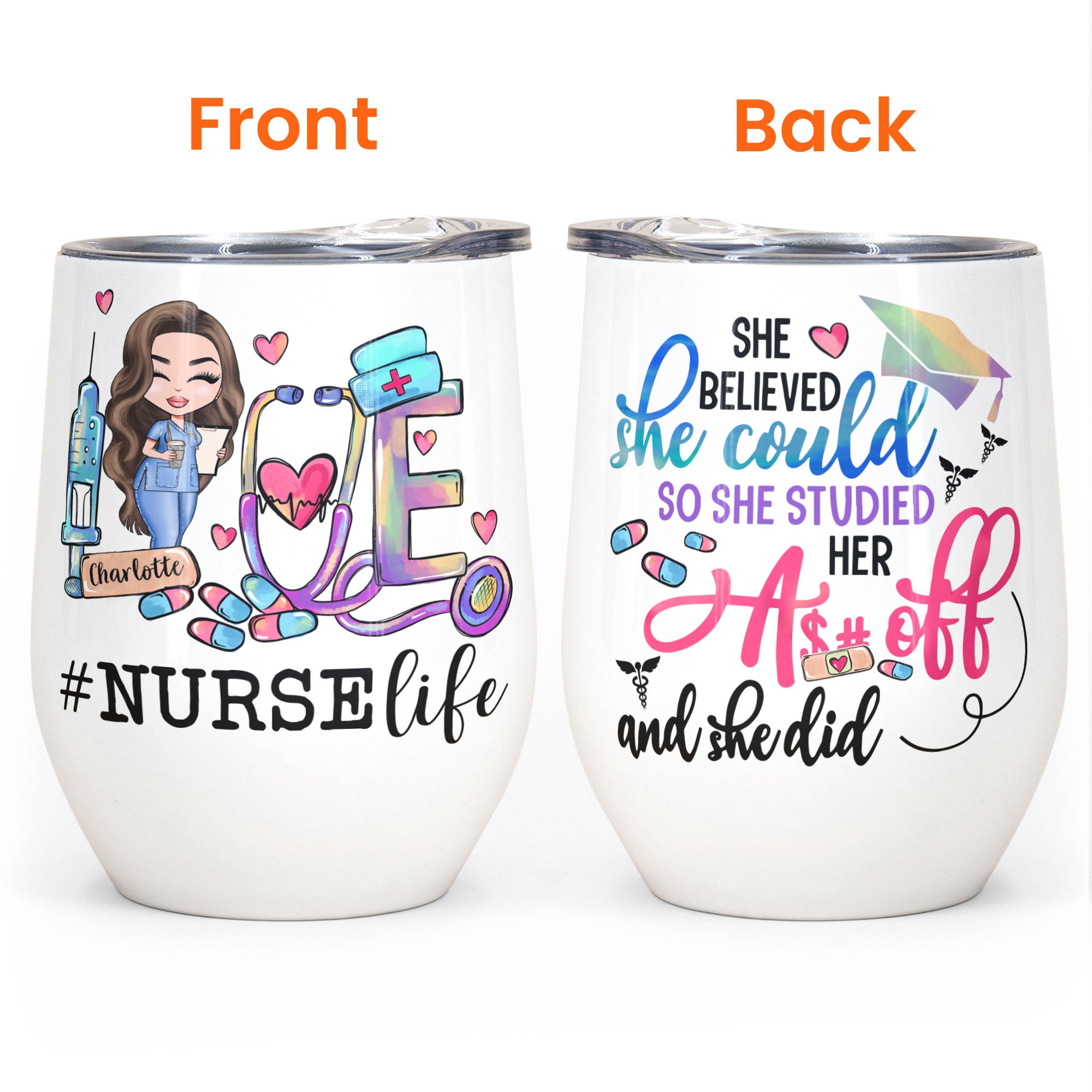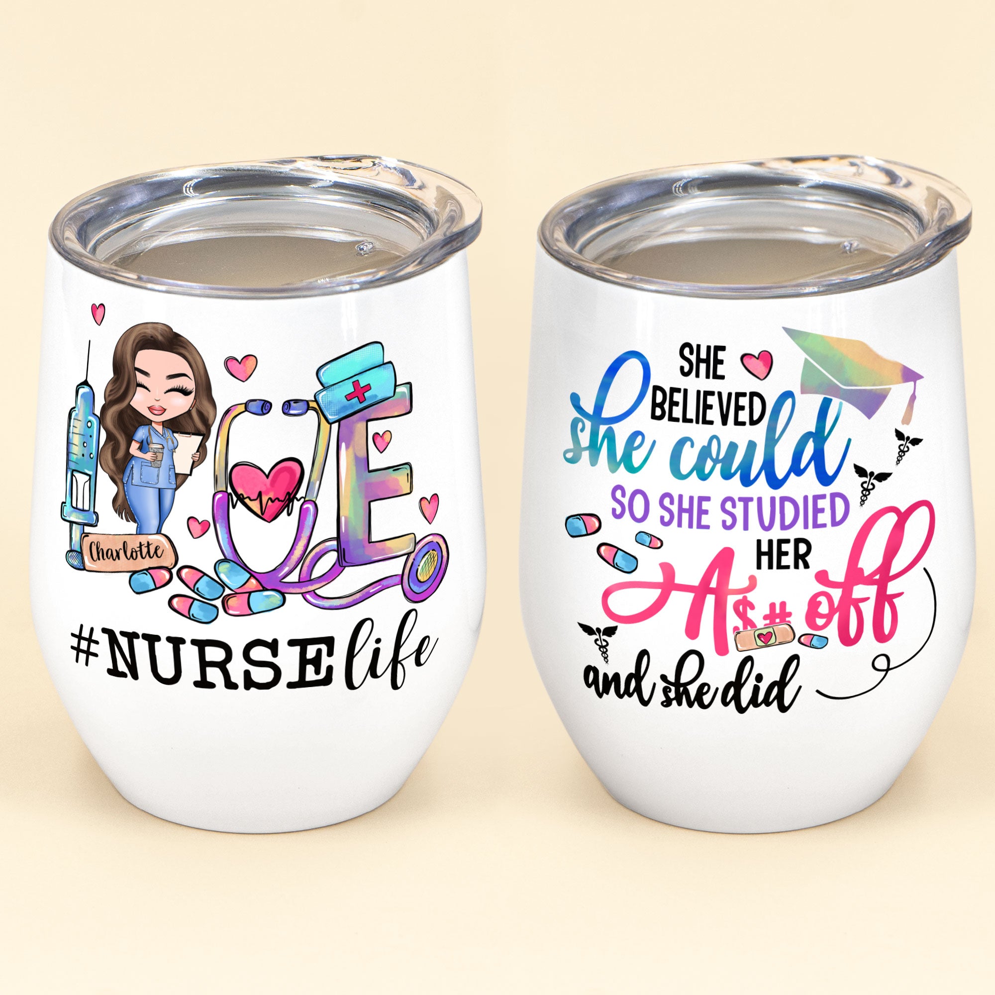 She Believed She Could So She Did – Personalized Wine Tumbler – Gift For Doctor & Nurse – Cartoon Nurse